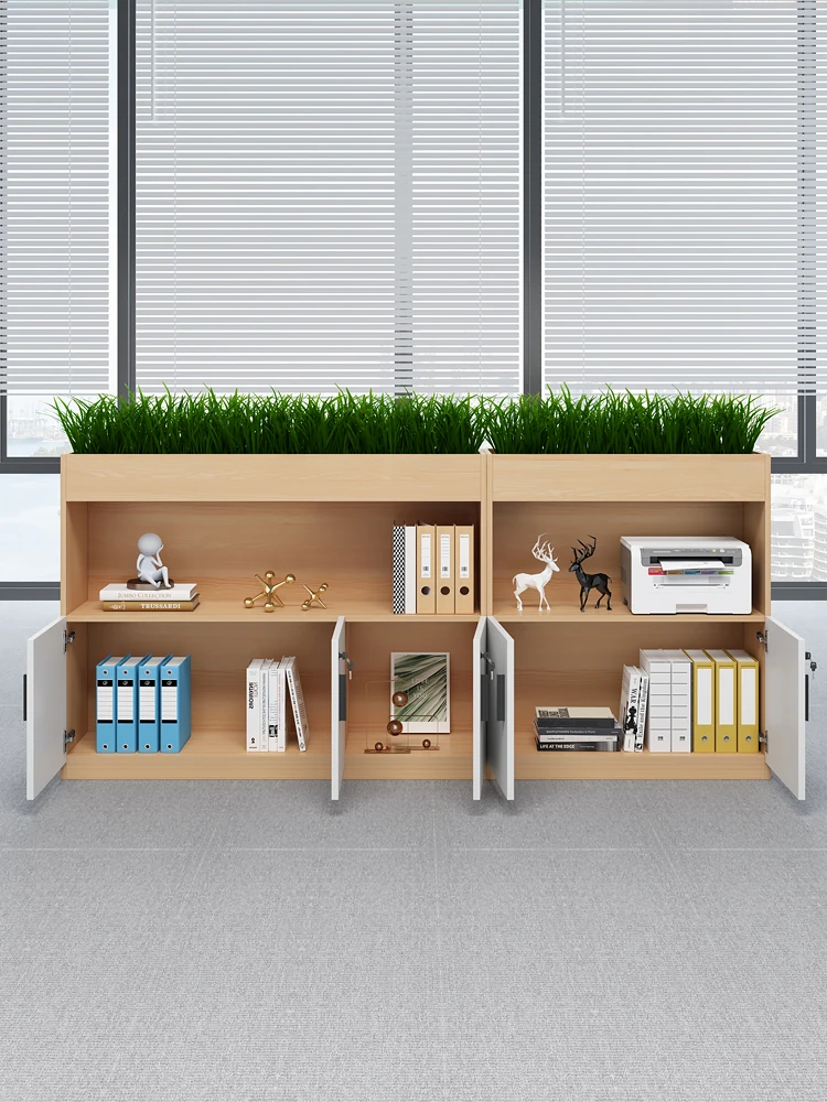 Office Partition Cabinet with Flower Slot - Stylish Low Storage Cabinet for Papers and Supplies - Wooden Organizer for Efficient Workspace Solutions